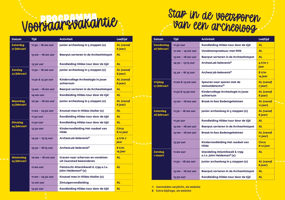 Kruip in de huid van een echte speurder op zoek naar het verleden. Of je nu met een metaaldetector op zoek gaat naar het ‘signaal van goud’ of liever meegaat op een spannende tijdreis met onze gidsen, er is voor elke jonge archeoloog iets te doen.
